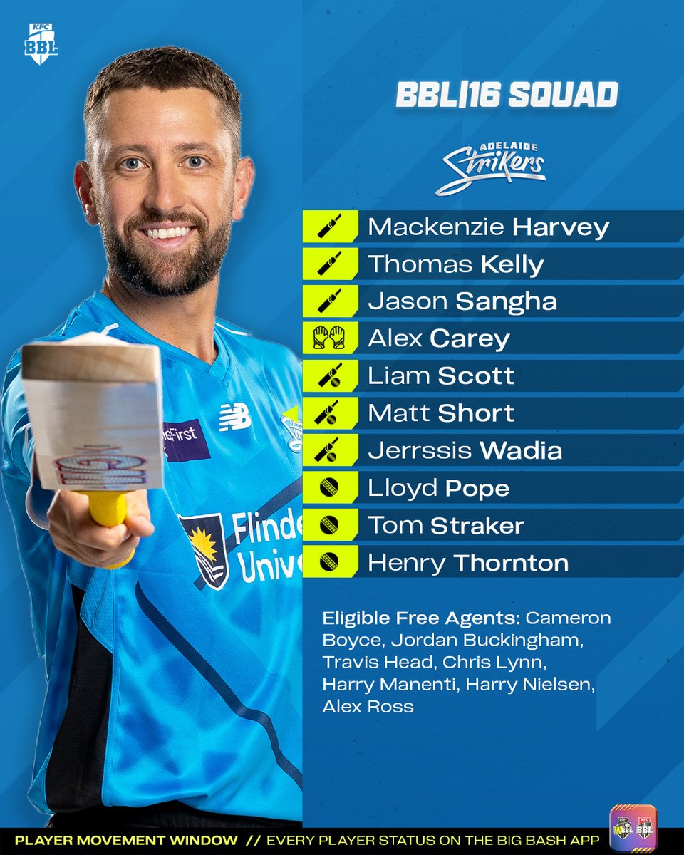 Contracted for BBL 16: Alex Carey, Mackenzie Harvey, Thomas Kelly, Lloyd Pope, Jason Sangha, Liam Scott, Matt Short, Tom Straker, Henry Thornton, Jerssis Wadia