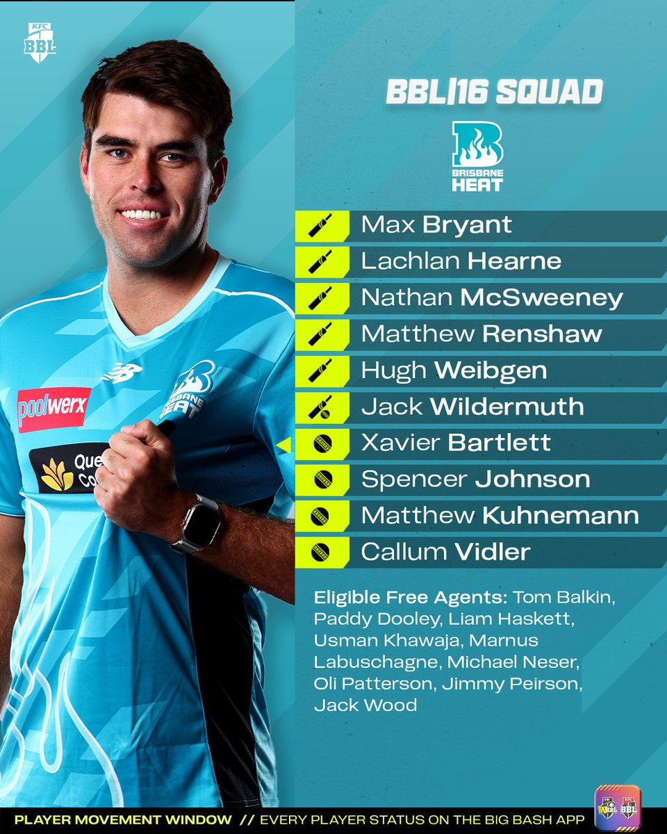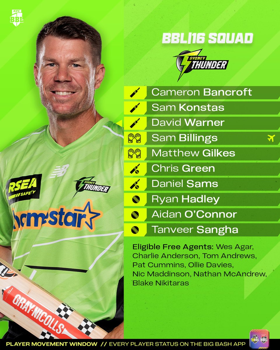 Contracted for BBL 16: Cameron Bancroft, Matthew Gilkes, Chris Green, Ryan Hadley, Sam Konstas, Aidan O’Connor, Daniel Sams, Tanveer Sangha, David Warner, Sam Billings (international)