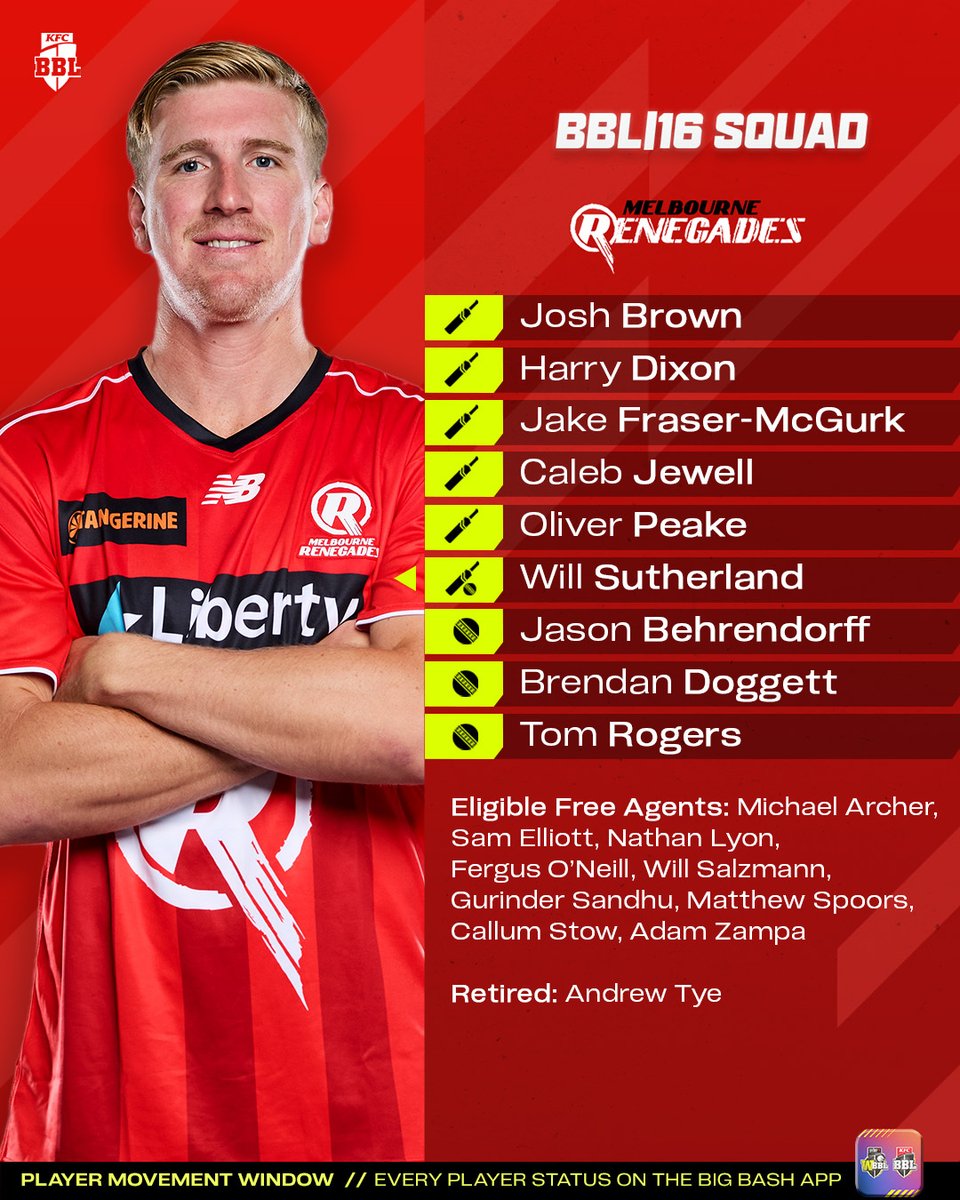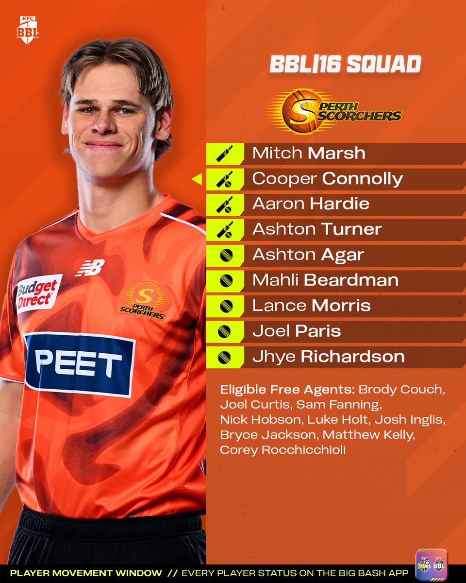 Contracted for BBL 16: Ashton Agar, Mahli Beardman, Cooper Connolly, Aaron Hardie, Mitch Marsh, Lance Morris, Joel Paris, Jhye Richardson, Ashton Turner