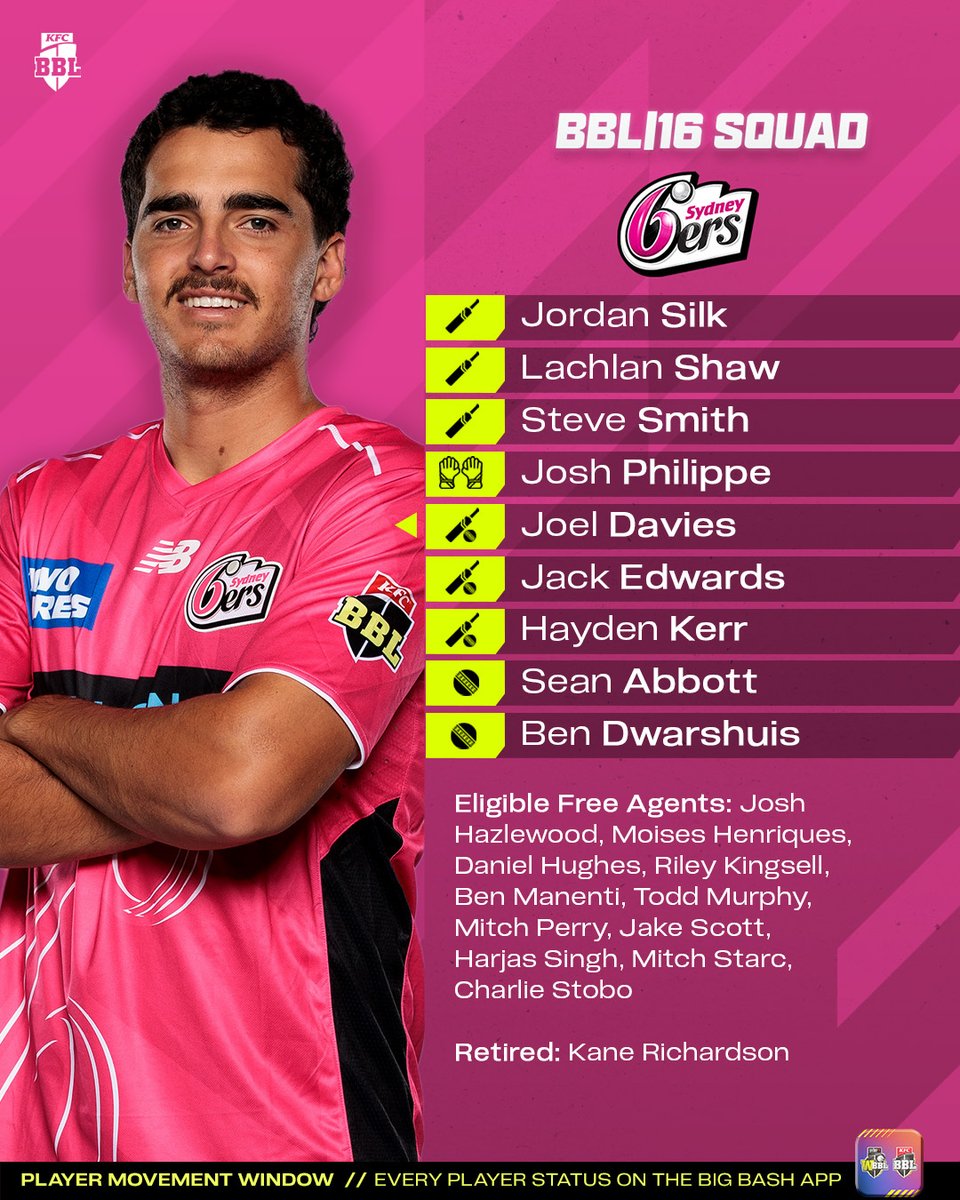 Contracted for BBL 16: Sean Abbott, Joel Davies, Ben Dwarshuis, Jack Edwards, Hayden Kerr, Josh Philippe, Jordan Silk, Lachlan Shaw, Steve Smith