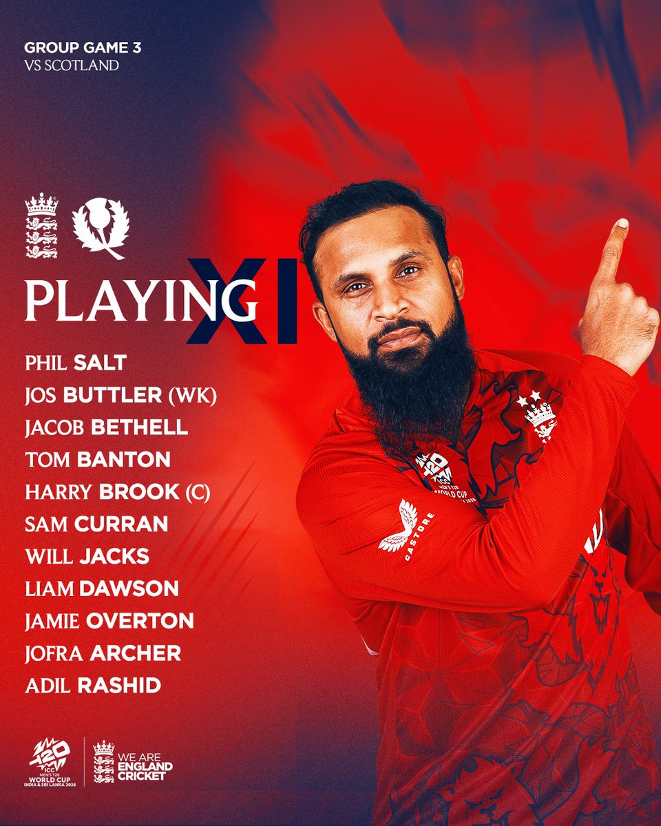 England playing XI vs Scotland- Match 23, T20 World Cup 2026
