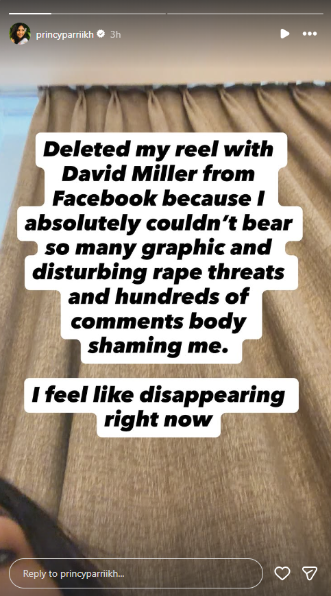 "Deleted my reel with David Miller from Facebook because I absolutely couldn't bear so many graphic and disturbing rape threats and hundreds of comments body shaming me," Parikh wrote on her Instagram.