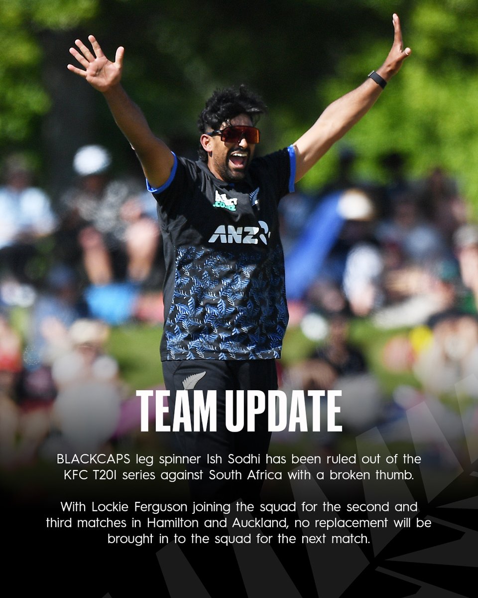 On Monday, the Blackcaps announced that Ish Sodhi has been ruled out of the remainder of the series. The leg-spinner suffered an injury to his thumb while bowling in the nets at the Bay Oval ahead of the first game of the series.