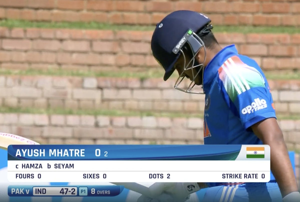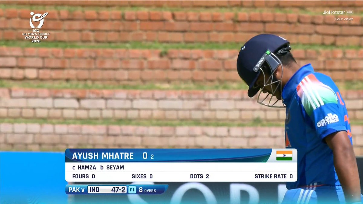 Ayush Mhatre has been dismissed for a two-ball duck against Pakistan U19 in Indiaâs final Super Six match of the 2026 ICC Menâs U19 World Cup. Blistering opener Vaibhav Suryavanshi also failed to make the most of his top-order blitz by gifting away his wicket to Pakistanâs new ball pacer Mohammad Sayyam.