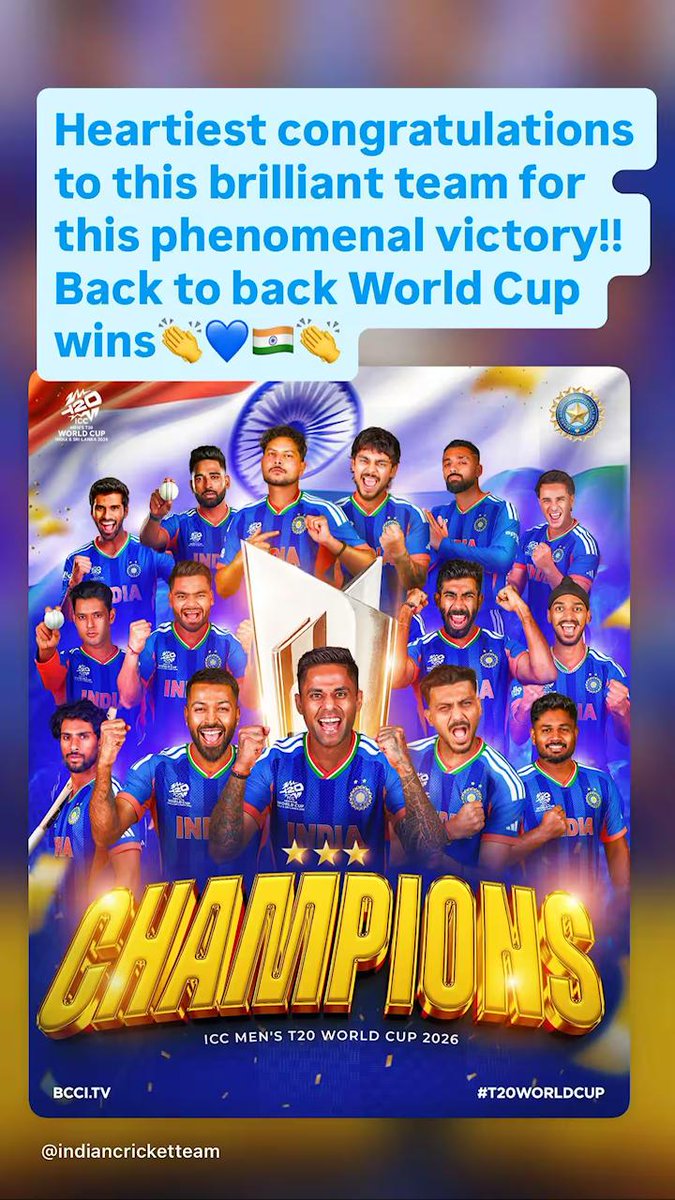 Meanwhile, Alia Bhatt also congratulated the team and praised Suryakumar Yadav led boys for their impressive victory. She wrote, "World Champions. Congratulations team India, what a victory."