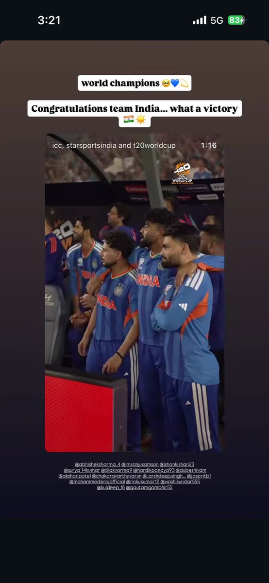 Actor Anushka Sharma also expressed her happiness through an Instagram story. She shared a photograph of the winning Indian team and congratulated them for their hard work and achievement.