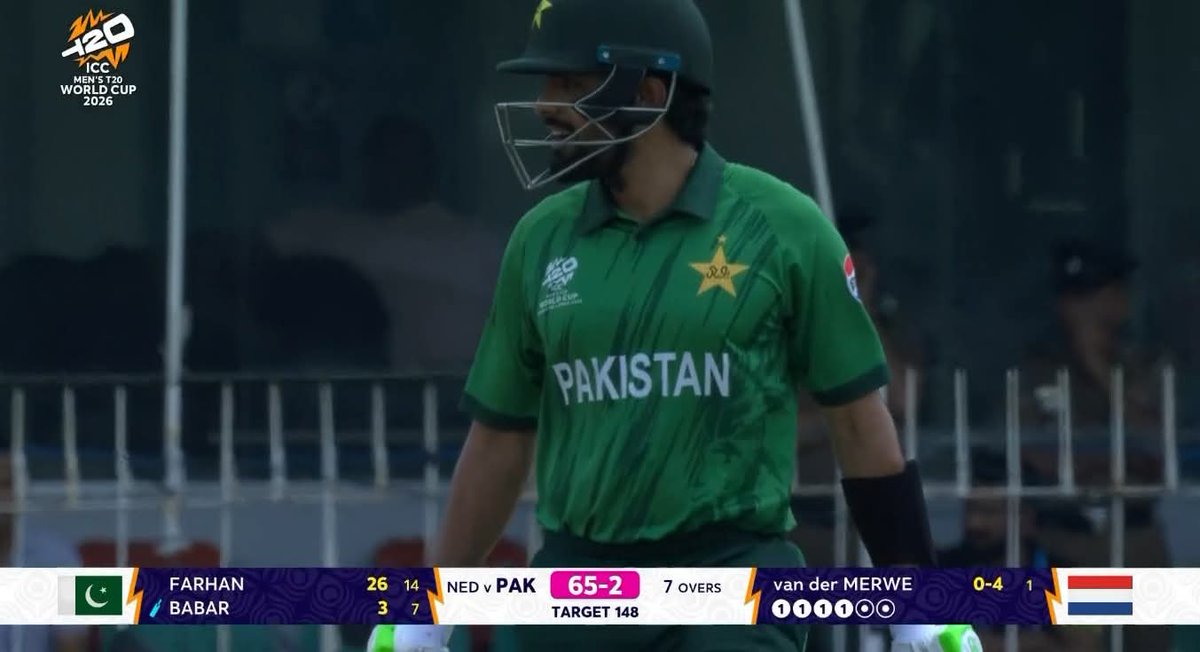 Babar Azam failed to go big against Netherlands in the opening match of the ICC T20 World Cup 2026. Batting at number four, the cricketer scored a sluggish 15 from 18 balls before slicing one towards Kyle Klein at long-off.