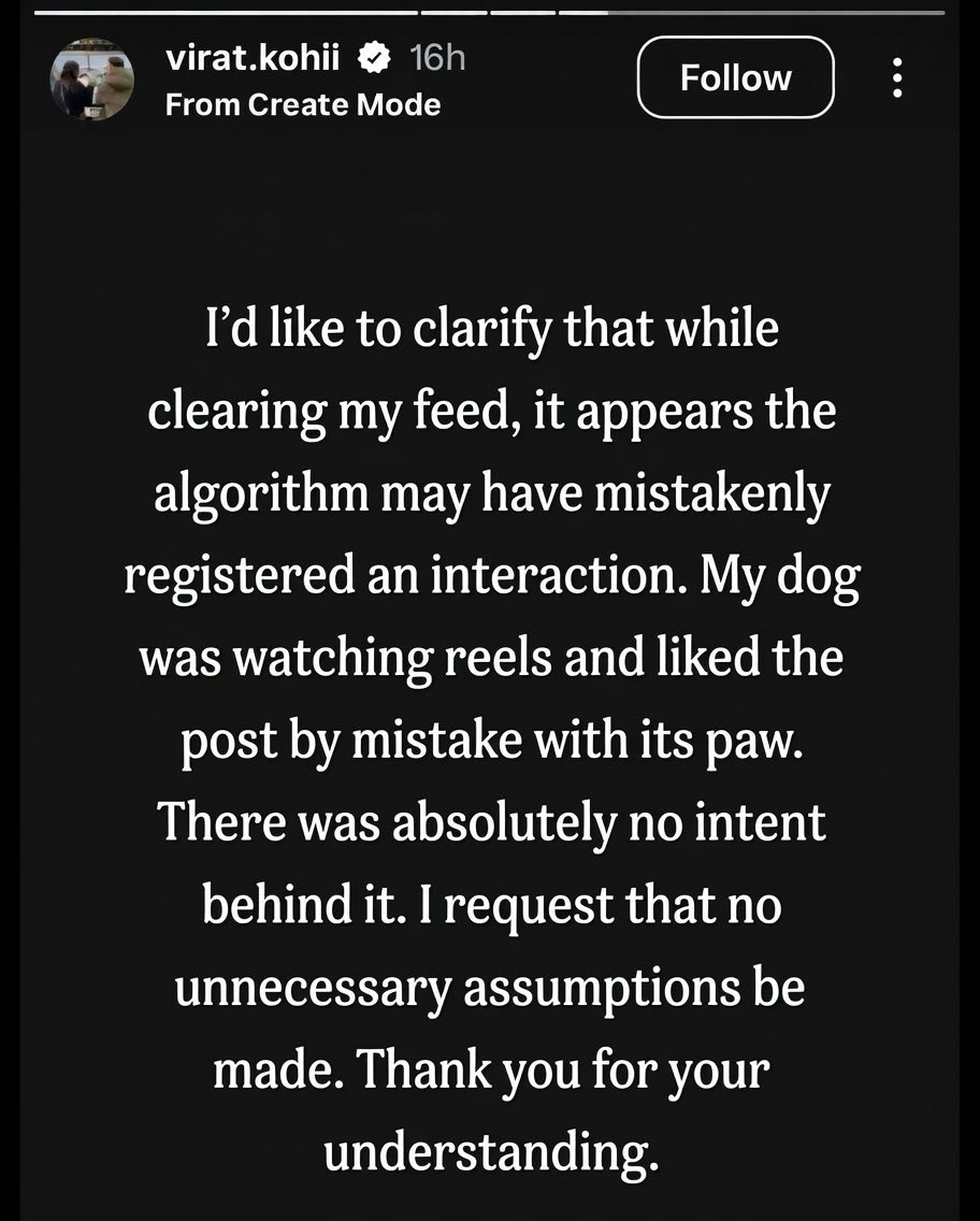 “I'd like to clarify that while clearing my feed, the algorithm may have mistakenly registered an interaction. There was absolutely no intent behind it. I request that no unnecessary assumptions be made. I appreciate your understanding,” Virat Kohli explained after liking a photo of Avneet Kaur.